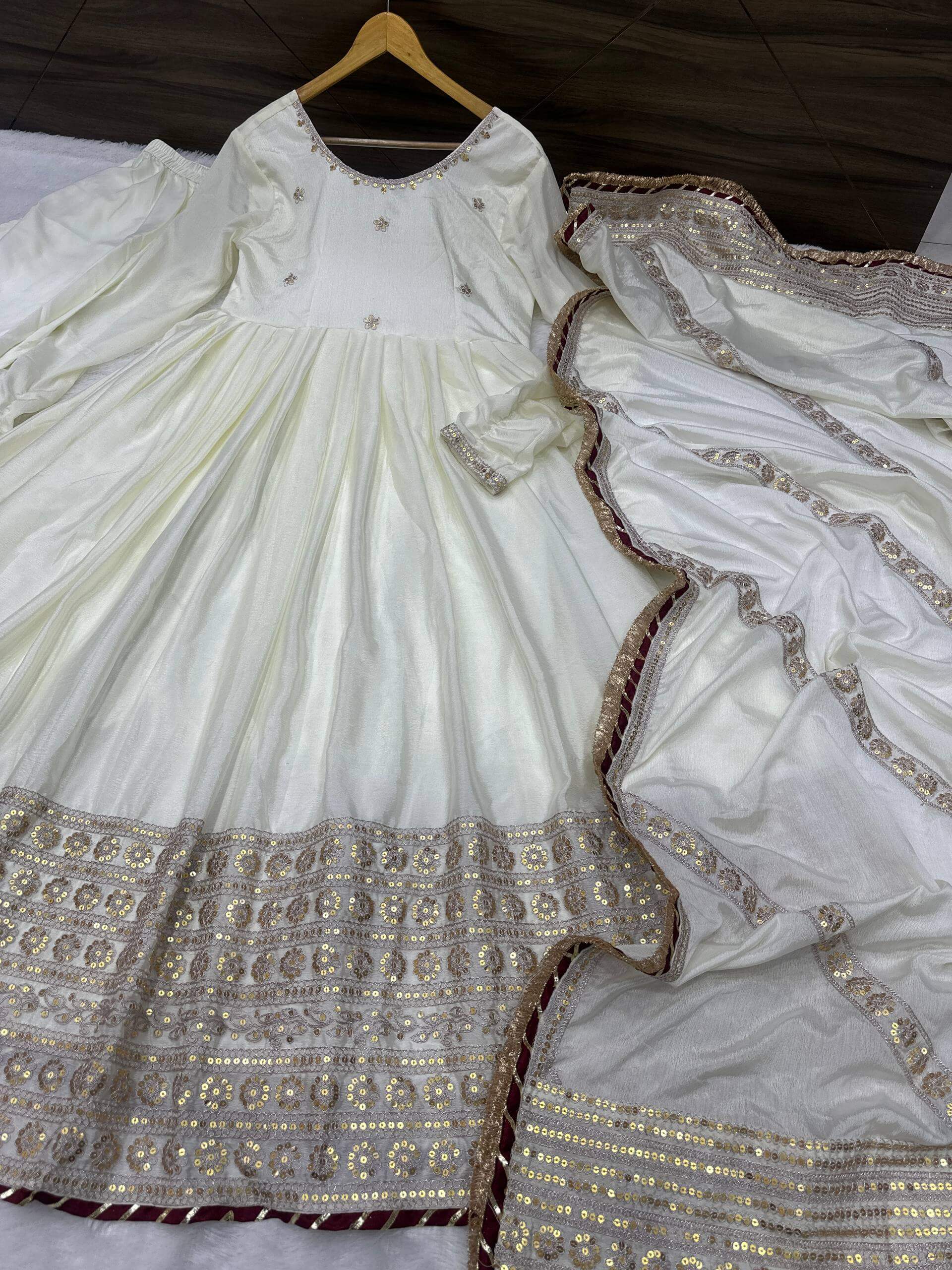 Paired with a matching Chinon silk dupatta detailed with embroidery and sequence cording work, and a fully stitched crepe silk bottom, this designer Anarkali gown set is ideal for weddings, festive functions, receptions, parties, and traditional celebrations.